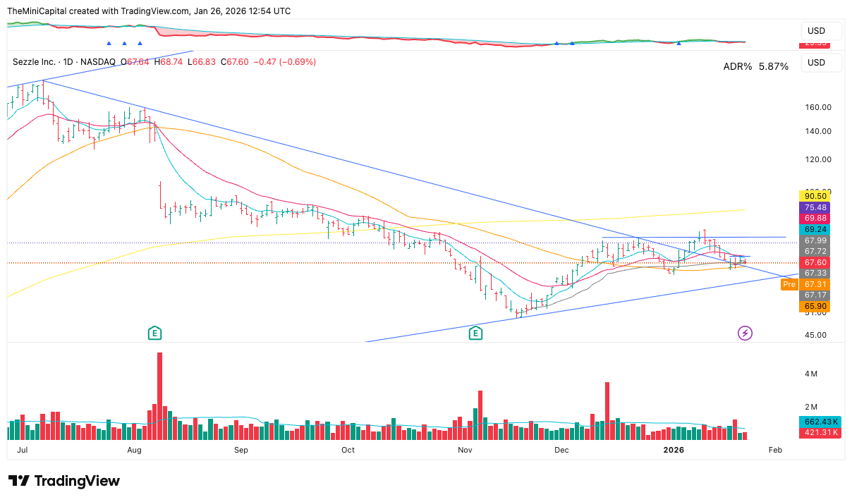Re-entered SEZL following a successful year-end run. The structural narrative has shifted from a downtrend to a series of higher lows and higher highs. Price is currently stabilising at the 50dSMA, which is beginning to slope upward. I’ve opened a position here during this tight consolidation with a stop at the lows of the week. I plan to add on a reclaim of the 9 and 21dEMAs.